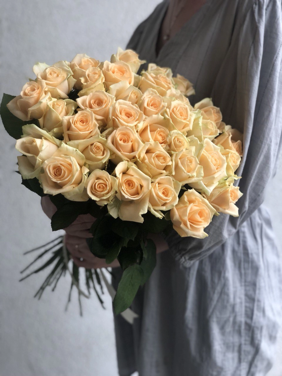 Этот изысканный букет собран из роз сорта Lizbeth, известных своим утончённым розово-персиковым оттенком и пышной пионовидной формой. Каждая роза словно создана для того, чтобы восхищать — лепестки плавно раскрываются, образуя воздушную, объёмную композицию.