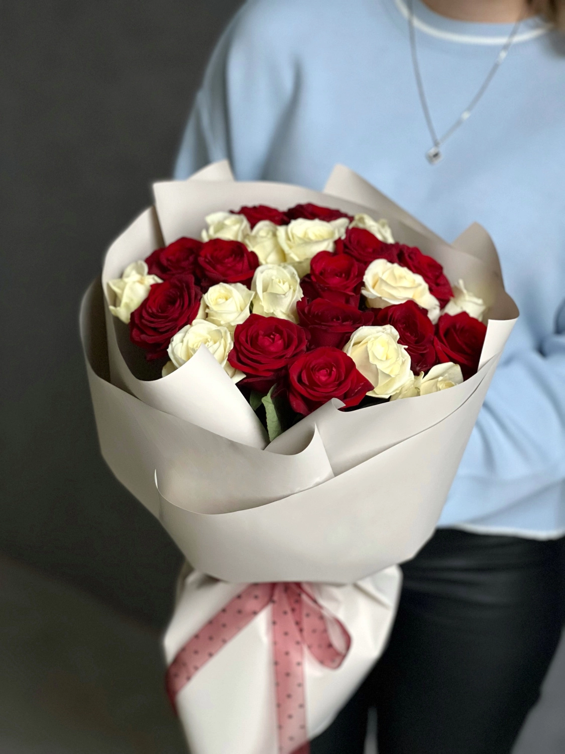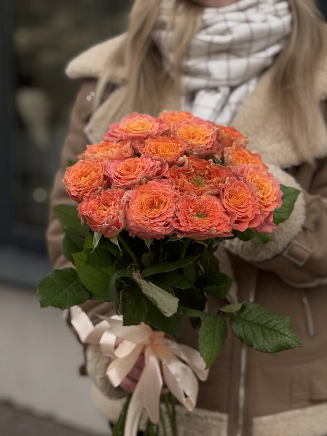 Оформление: Букет аккуратно собран и оформлен в стильной упаковке, подчеркивающей красоту цветов. Дополнительно могут быть использованы зелёные листья и декоративные элементы для создания гармоничного образа.